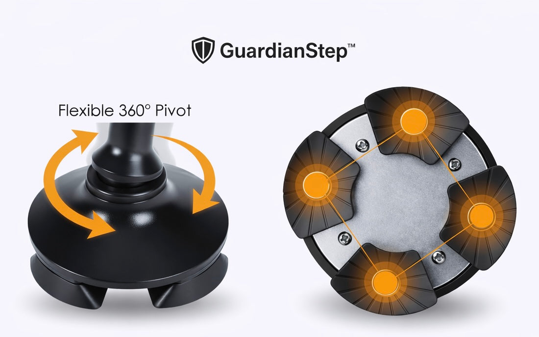 The GuardianStep™ features a flexible 360° pivoting neck that mimics natural ankle movement for constant ground contact. Its anti-skid 4-foot base provides superior traction and allows the cane to stand independently. Engineered for versatility, it ensures maximum stability on everything from rugged gravel to polished indoor floors.